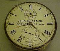 By this time the Bliss company was using movements made by London maker Victor Kullberg. This is a typical Kullburg reverse-fusee movement with a basic "Earnshaw" style balance. No auxiliary compensation was needed on a survey chronometer, and at this time the Navy no longer accepted chronometers with auxiliary compensation because of the difficulty of keeping them in adjustment. The fact that this has a steel hairspring may indicate that it was made for sale to the Navy. At this time John Bliss & Co., like some other makers, often used palladium hairsprings which are resistant to rust, magnetism, and are less affected by temperature. The Navy, however, demanded steel hairsprings on chronometers made for them. Palladium hairsprings, which are silver to white in color, were known to be softer and harder to work with than steel.